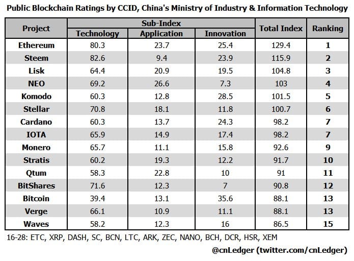 In what is surprising the decentralized cryptographic ledger world today China's Governmental organization, the CCID (China Center for Information Industry Development), has just published an Index (to be updated monthly) of its top 28 Blockchain Technologies, based on three factors: Technology, Application, and Innovation. Ethereum came in at number one.