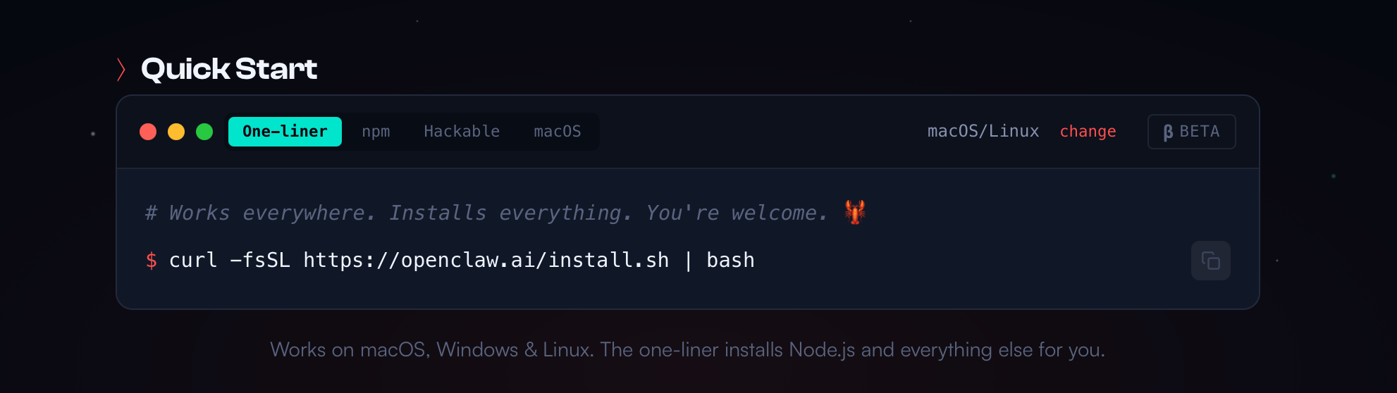 - Go to OpenClaw.ai and copy their single line of code it looks like this ($curl -fsSL https://openclaw.ai/install.sh | bash) $free