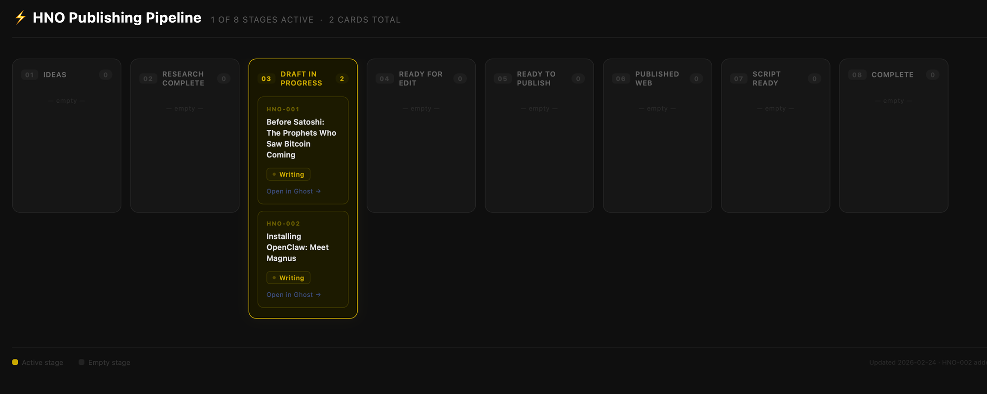 - Full content pipeline: 8-stage publishing board (designed a KanBan board, updates verbally)